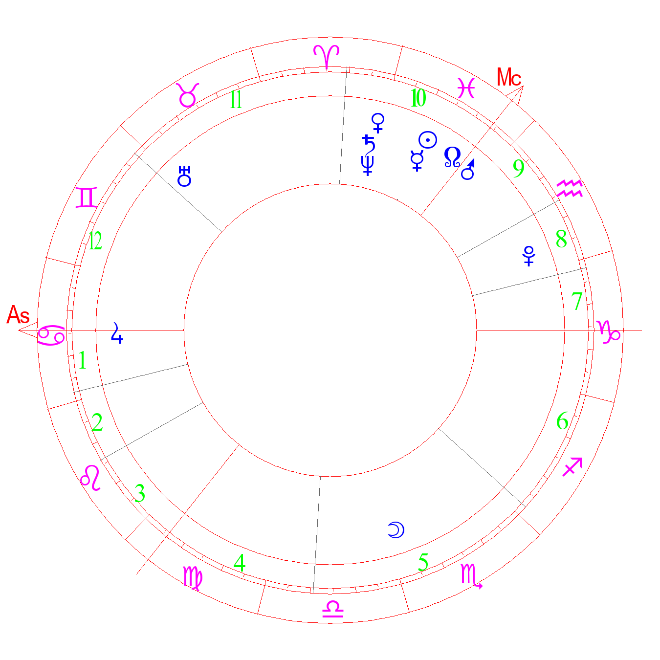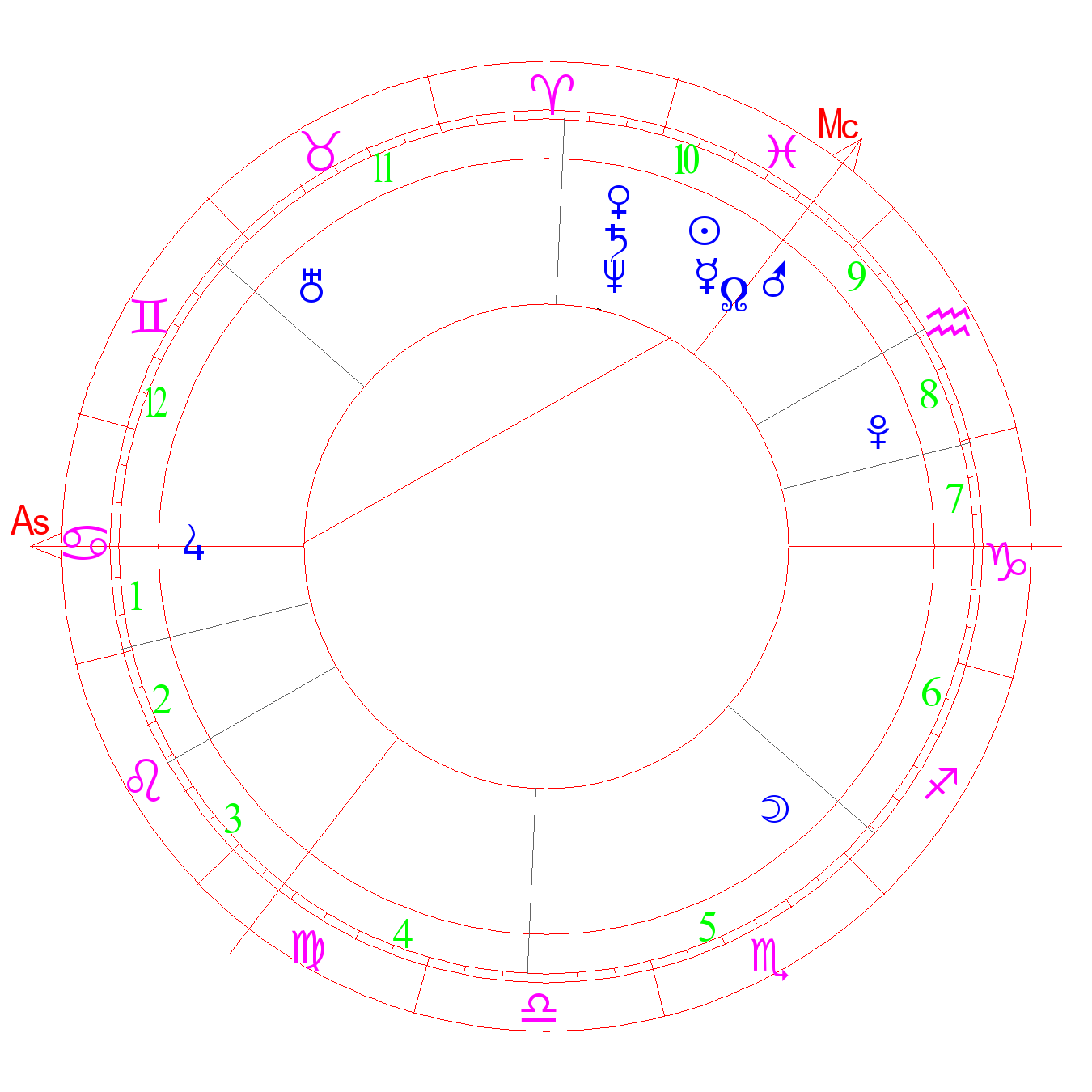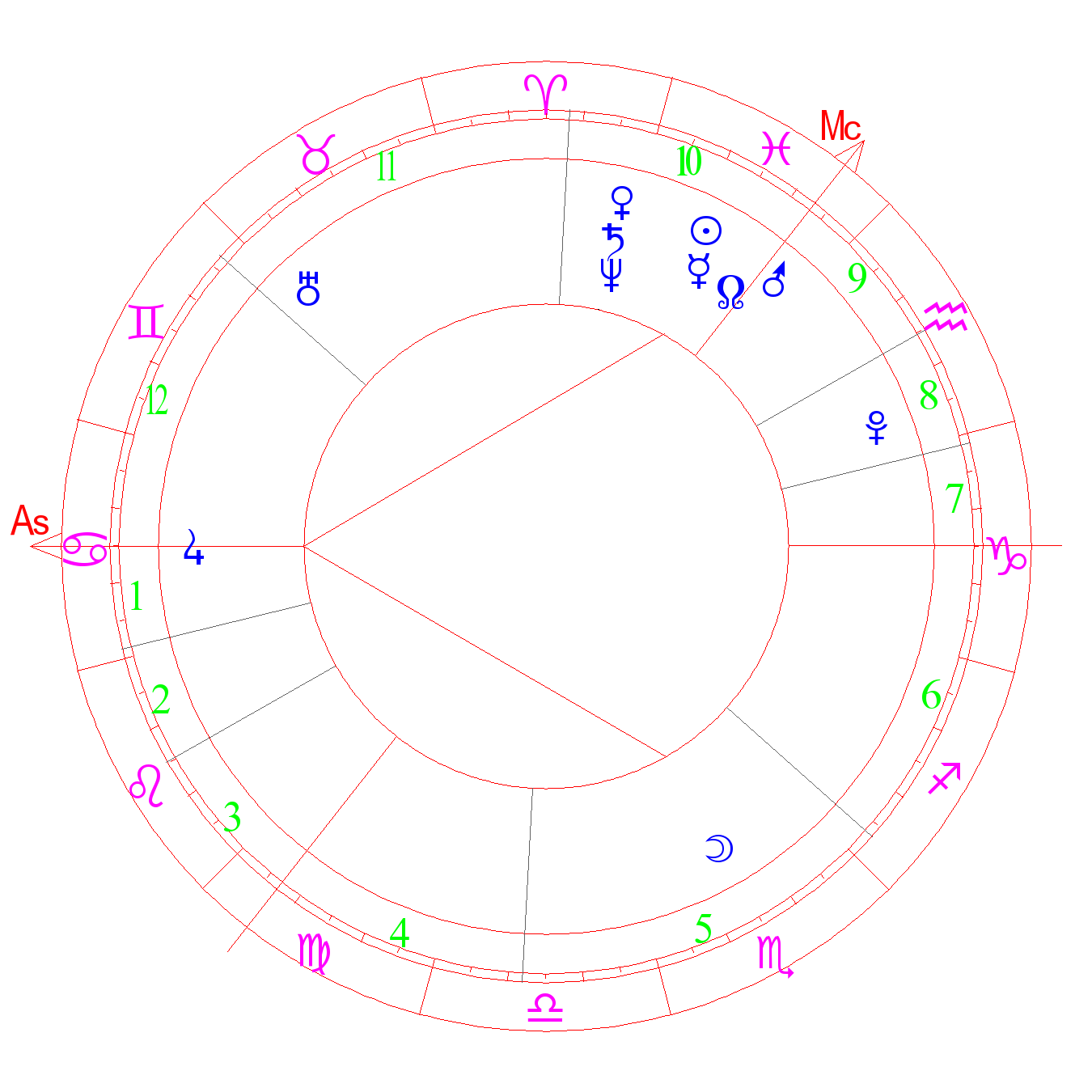 The degree of healing, occultism, great enthusiasm. Loneliness, harmony, musicality. A person with a great imagination, higher spirituality, detachment, not of this world. [-] suicide or bladed weapon wounds (ASA). Fight without success, frustration, lack of courage. The degree of Mercury (Kefer)